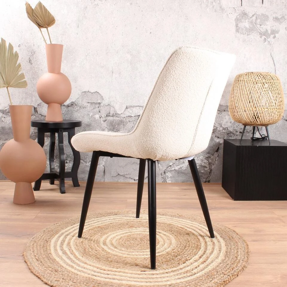 De geliefde Benito eetkamerstoel 2.0 in een nieuw (zacht) jasje. Deze Benito eetkamerstoel is bekleed met een prachtige bouclé stof. Dit geeft deze comfortabel eetkamerstoel een chique uitstraling, helemaal van deze tijd. Benito bouclé is verkrijgbaar in wit, grijs of beige. Voor ieder wat wils. Benito is voorzien van een ruitpatroon in de rugleuning. De zitting is bevestigd op een stevig metalen onderstel in de kleur zwart. Bouclé is helemaal van nu, deze eetkamerstoel past dan ook binnen een Scandinavisch, tijdloos en modern interieur. De stof voelt heerlijk zacht aan en heeft een prettige uitstraling. Daarnaast is Benito ook verkrijgbaar in zeven kleuren velvet.