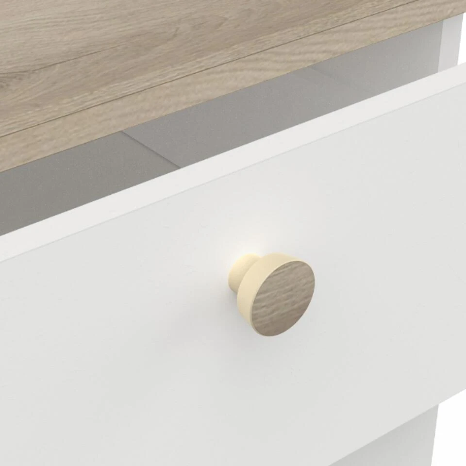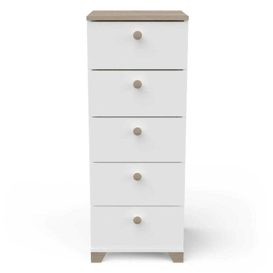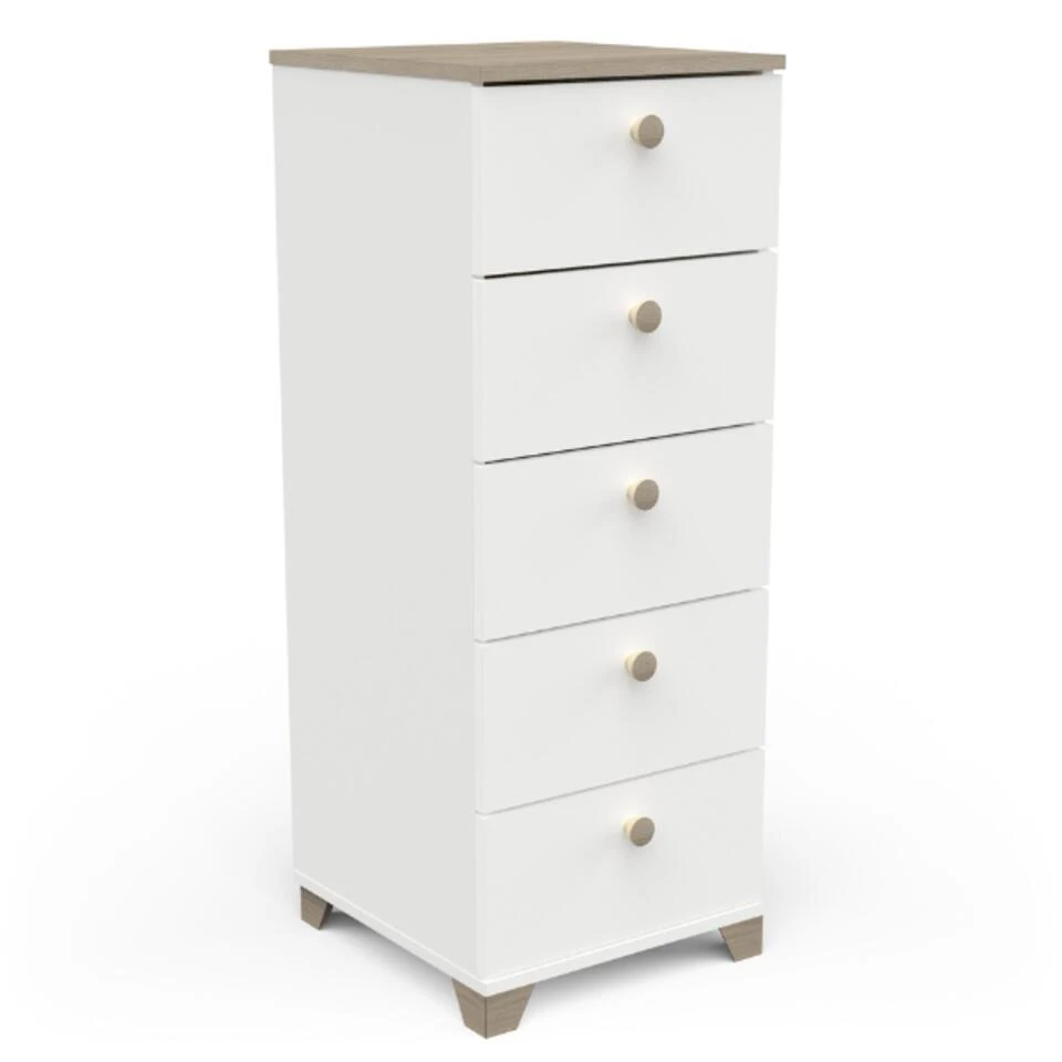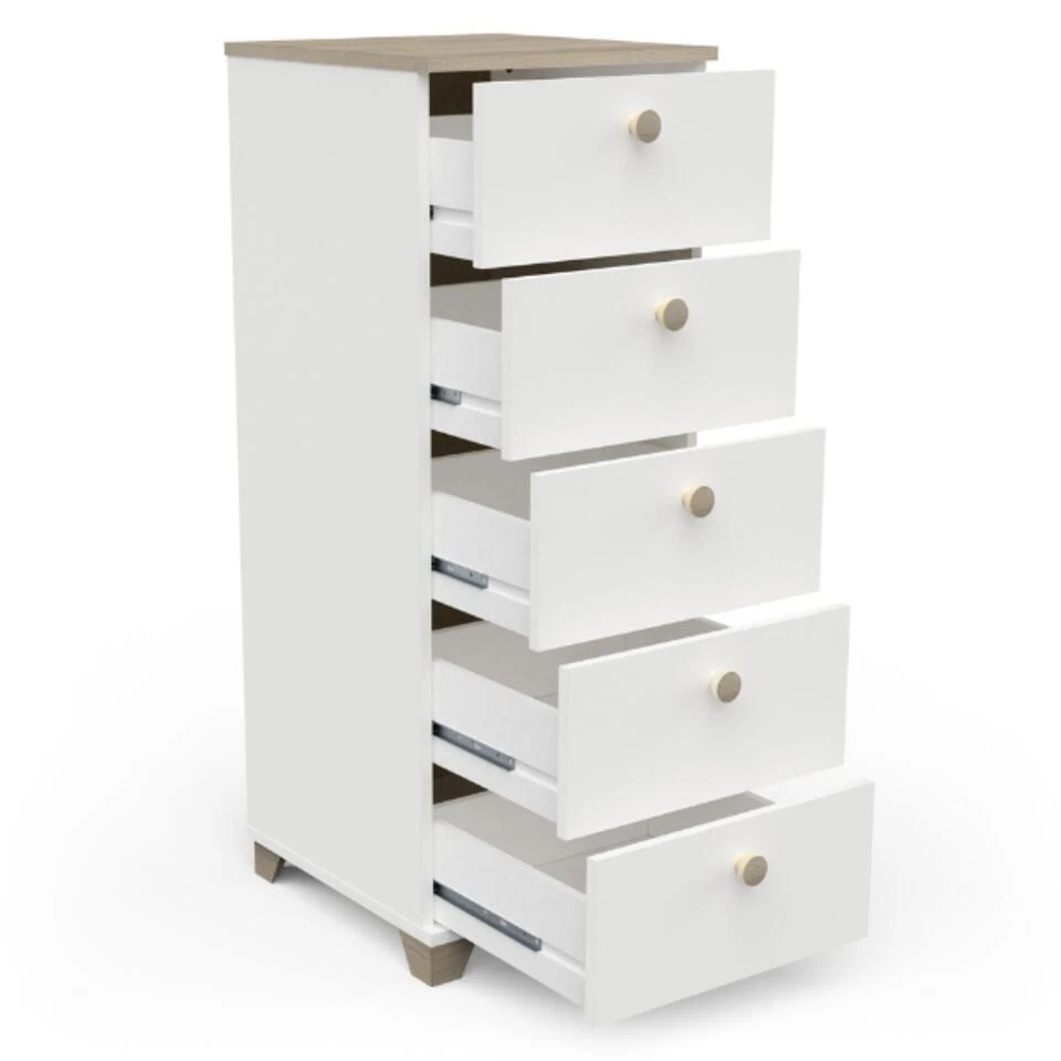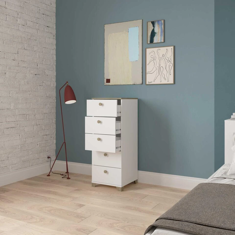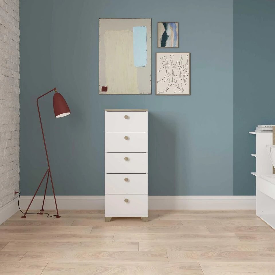 De lichte natuuraccenten in Kronberg eikdecor en het mat wit maken dat dit kastje perfect geïntegreerd kan worden binnen een Scandinavische woonstijl. Dit kastje met 5 lades kan gebruikt worden voor het opbergen van allerlei kleine spullen en documenten. Creëer extra opbergruimte in bijna elke kamer van het huis met opbergkastje Liva! Schroeven en pluggen voor wandmontage niet inbegrepen.