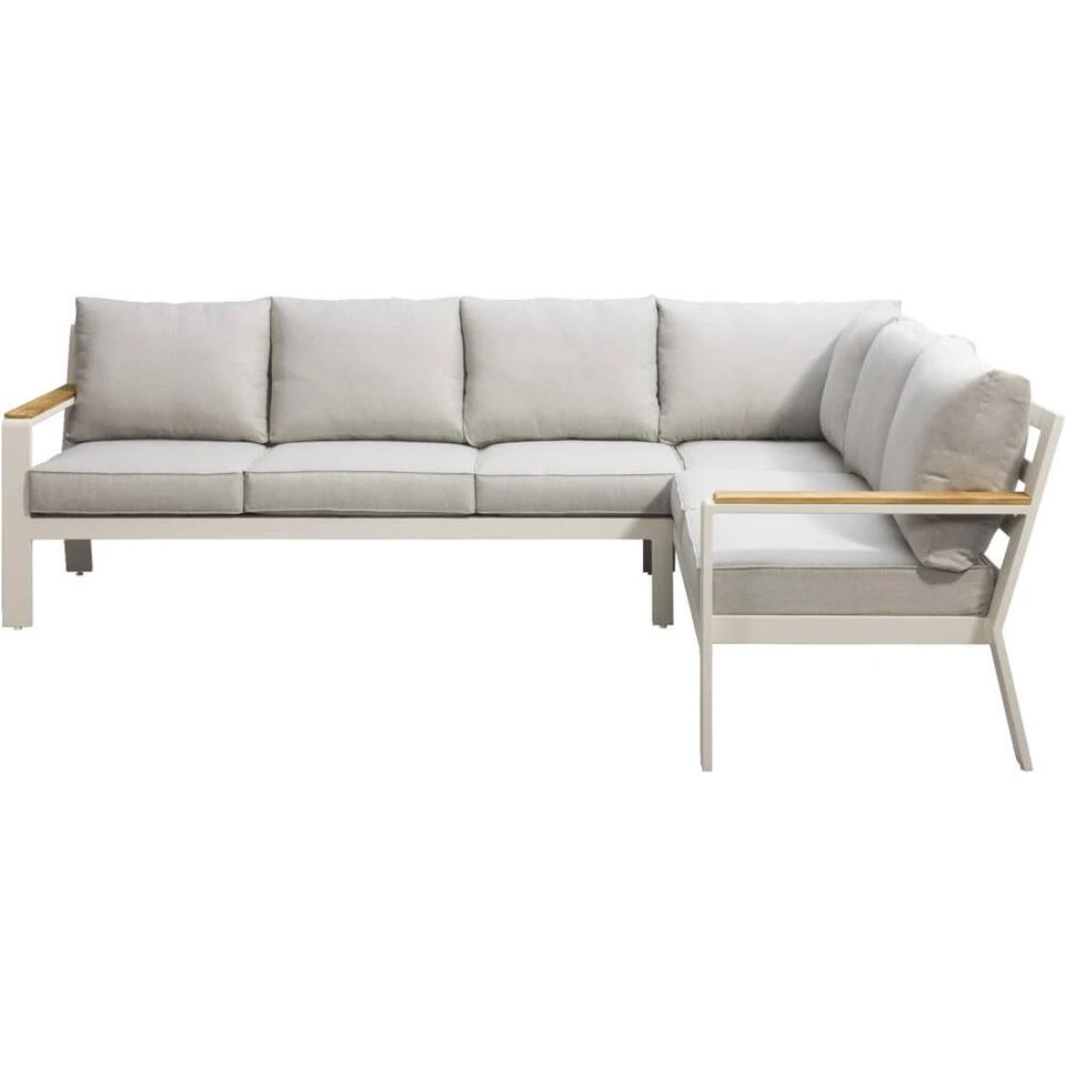 Loungebank Biarritz is een loungebank met een hoekopstelling in de kleur zand/grijs. Wil je heerlijk buiten genieten van het lekkere weer, dan is deze buitenset uitstekend geschikt. De loungebank is gemaakt van aluminium met teakhouten details op de armleuningen, dit zijn hoogwaardige en duurzame materialen. Hierdoor gaat loungebank Biarritz ook nog eens lang mee. Richt jouw tuin gezellig in en de zomer kan beginnen!