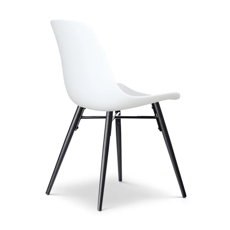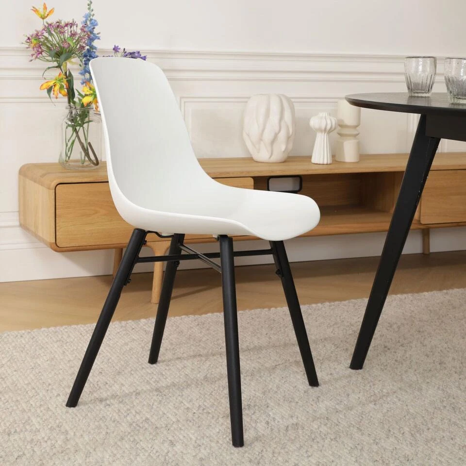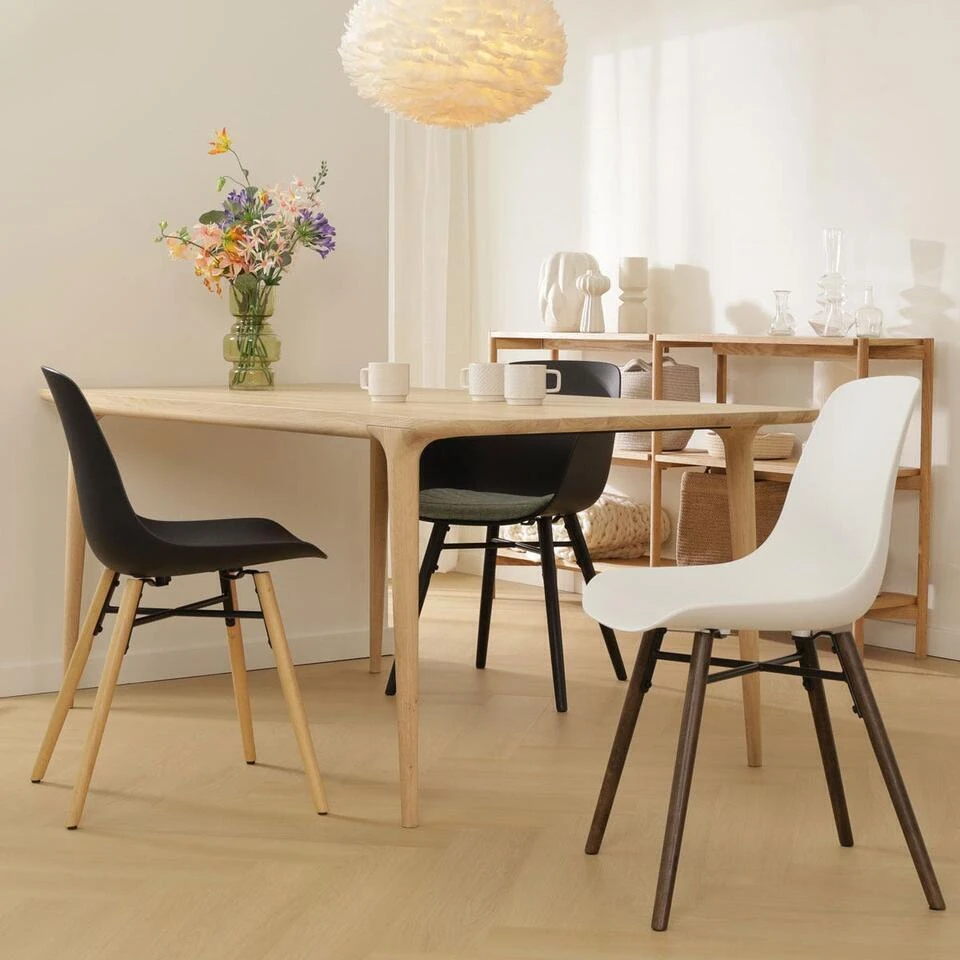 De eetkamerstoel is ontworpen met een moderne kunststof zitting en een houten onderstel met metalen kruisverbinding. De stevige beukenhouten poten in zwarte kleur zorgen voor een chique sfeer in de eethoek zorgt. Tegelijkertijd vormt dit natuurlijke materiaal een mooie balans met de strakke kunststof zitting. Kunststof is van nature slijtvast, waardoor de stoel bestand is tegen dagelijks gebruik en langdurige belasting. De kunststof zitting is bovendien ergonomisch ontworpen om ultiem comfort te bieden tijdens lange diners en gezellige avonden met vrienden en familie. Wil je toch iets zachter zitten? Combineer deze kunststof stoel in het wit of zwart dan met één van de losse stoelkussens van Nolon, die speciaal ontworpen zijn om perfect op de eetkamerstoelen van het merk aan te sluiten.