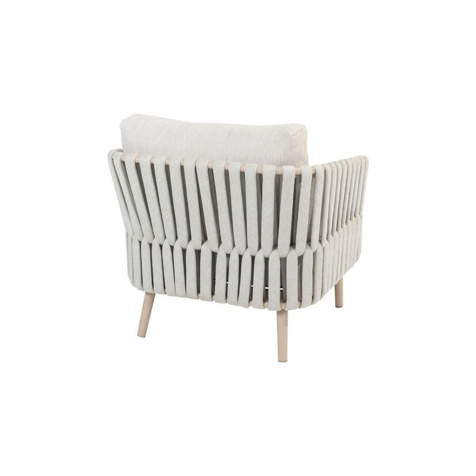 De Eva stoel-bank loungeset van Taste heeft een frame van aluminium. Een materiaal dat licht van gewicht is en een lange levensduur heeft. Dit aluminium heeft een poedercoating gekregen in de kleur ‘latte’. Een beige kleur die een unieke uitstraling aan deze loungeset geeft. Om het aluminium frame zijn brede stroken rope of touw gevlochten. Door deze brede stroken heeft deze stoel echt een unieke uitstraling gekregen. De zit- en rugkussens worden standaard meegeleverd en zijn gemaakt van Olefin. Deze stof is bestand tegen alle weersinvloeden, ze kunnen dus tegen een regenbuitje! Toch raden wij wel aan om de kussens droog op te bergen wanneer deze niet worden gebruikt, zo blijven de kussens het langste mooi.