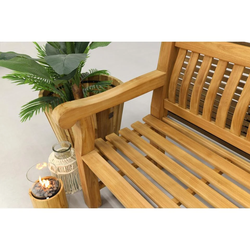 Gemaakt van robuust teakhout, is deze bank uitstekend bestand tegen de wisselende weersomstandigheden in Nederland. Teakhout is een hardhoutsoort met een hoge dichtheid en natuurlijke oliën, waardoor het duurzaam is en weinig onderhoud nodig heeft. Een regelmatige schoonmaakbeurt met een zachte borstel en water houdt het hout in topconditie. Om de warme kleur van het hout te behouden en vergrijzing te voorkomen, kun je de bank behandelen met Teak Protector.